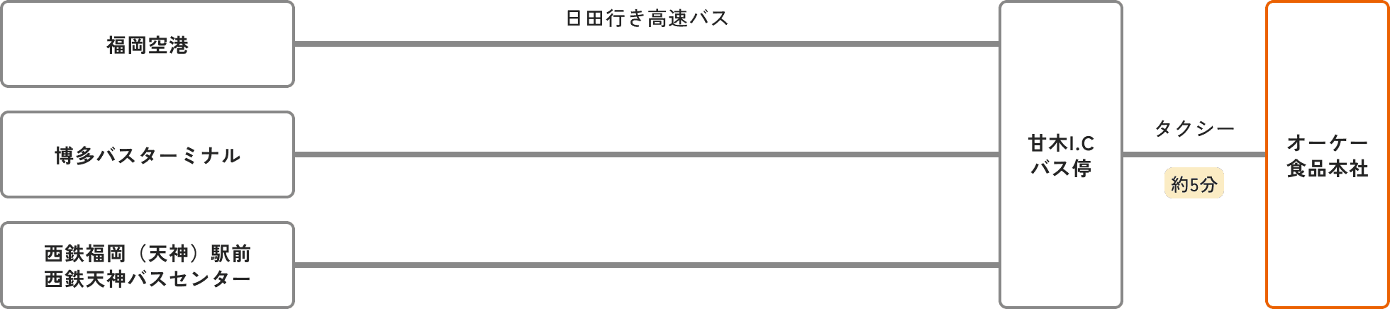 福岡空港、博多バスターミナル、西鉄福岡(天神)駅前西鉄天神バスセンターから、日田行き高速バスで甘木I.Cバス停で下車し、タクシーで約5分。