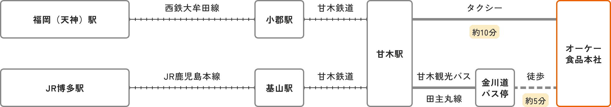 または、JR鹿児島本線 博多駅より快速で、基山駅下車。甘木鉄道基山駅より、終点甘木駅で下車。
