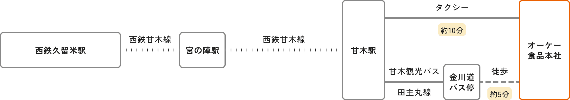 または、甘木鉄道甘木駅前のバス停より甘木観光バス田主丸線で金川道バス停で下車し、徒歩5分。
