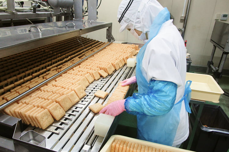 主な仕事内容は、製品の良品・不良品を仕分ける作業や、油揚げの品質を確認しながらフライヤー油の温度調整などの管理を行っています。