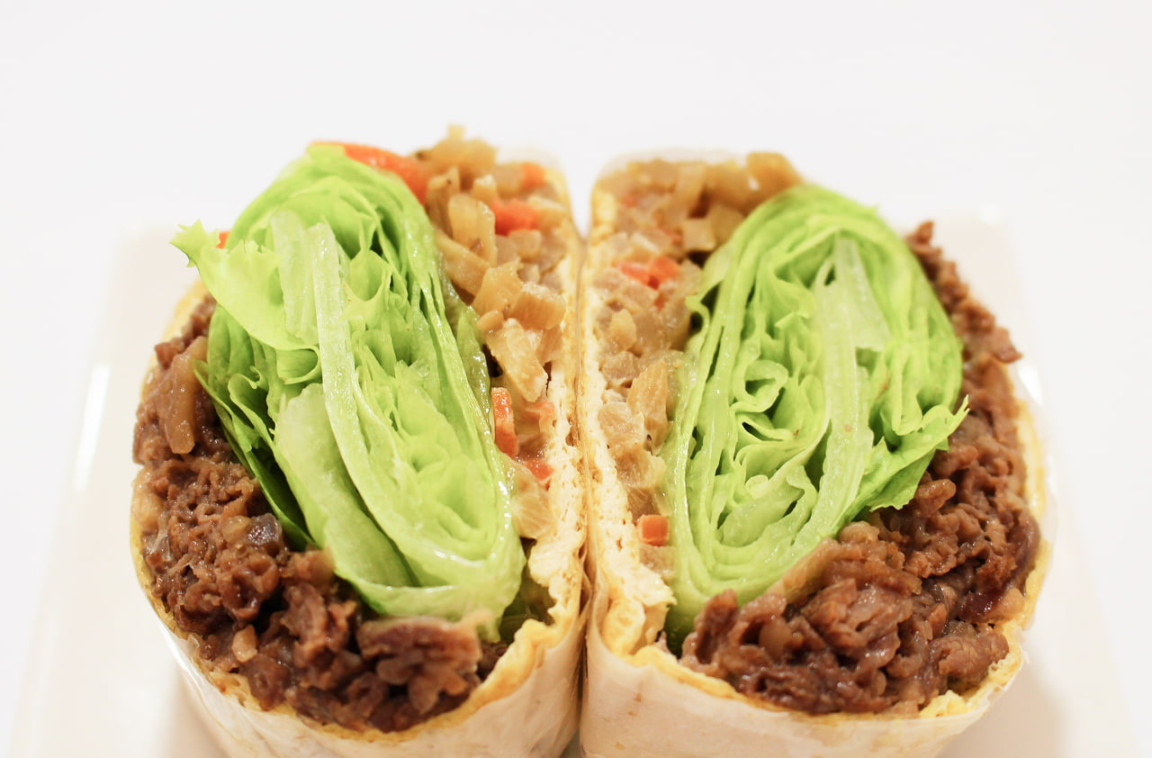 - クッキングペーパーを広げ、油揚げを置き、牛肉、レタス、きんぴらごぼうを油揚げで挟めるだけ挟みます。