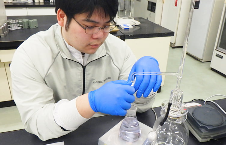 業務内容としては、数ある品種の大豆を成分分析し、実際に油揚げを作り、その品質から油揚げ生産に適した品種の調査を行っています。その他、より良い品質の油揚げを作るにはどうすれば良いか、これまでの物とは違う画期的な揚げを作るにはどうすればよいか等を模索する基礎研究も行っています。